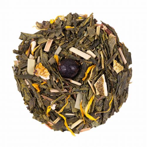 Ingrédients: Thé vert China Sencha, tulsi, écorces de citron, morceaux de mangue, badiane, cassis.