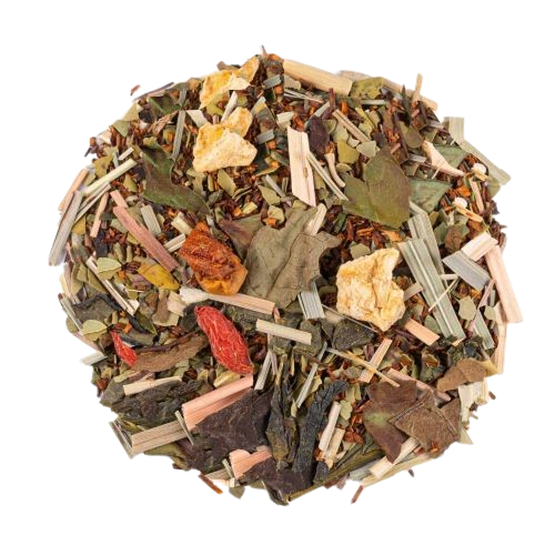 Rooibos naturel, maté vert, citronnelle, thé vert china sencha, thé blanc Pai Mu Tan, papaye, pêche, baie de goji, feuilles d’olivier, fleurs de bleuet.