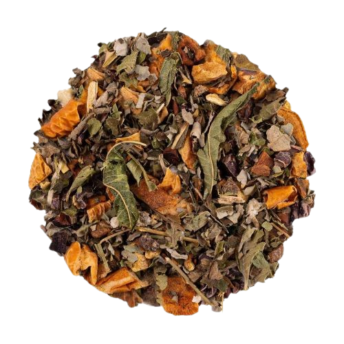 Pomme, feuilles de mûre; fève de cacao concassée, bâtons de cannelle, gingembre, verveine, tranches d’orange, physalis, noix, vanille